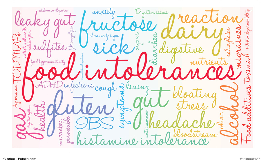 Food Intolerances word cloud on a white background.